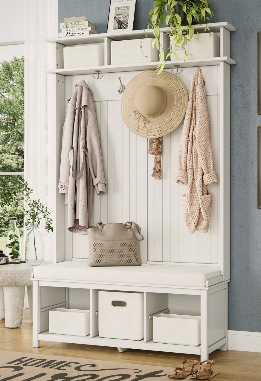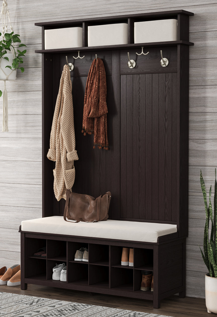 • Hall Tree with Bench & Storage: Get seating, shoe storage, coat hooks, and cubbies in one.